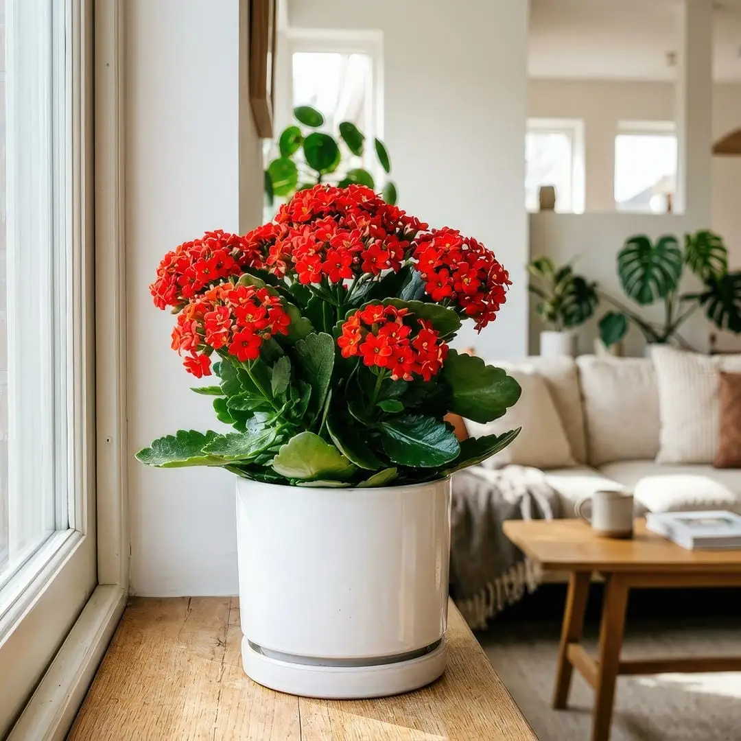 If your desk gets good natural light, a single Flaming Katy in a clean white or grey pot adds a surprising amount of life to a workspace. The blooms last for weeks, so you get sustained color without the maintenance of cut flowers.