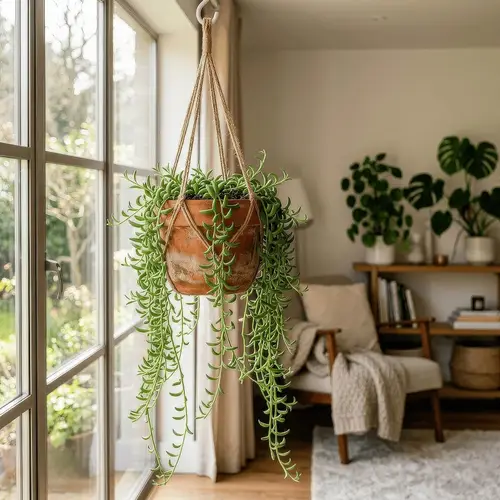 - Burro's Tail (Sedum morganianum): A different family entirely (Crassulaceae), but a fellow trailing succulent with plump, teardrop-shaped leaves that cascade in thick, rope-like strands. Non-toxic to pets and famously fragile to handle.